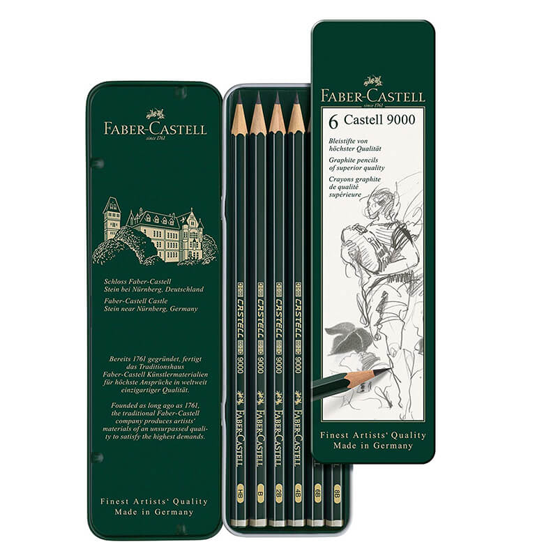 Dans cette boîte de rangement en métal, Faber Castell vous propose un set de 12 crayons graphite Castell 9000, déclinés en 12 degrés de dureté : 5B, 4B, 3B, 2B, B, HB, F, H, 2H, 3H, 4H et 5H