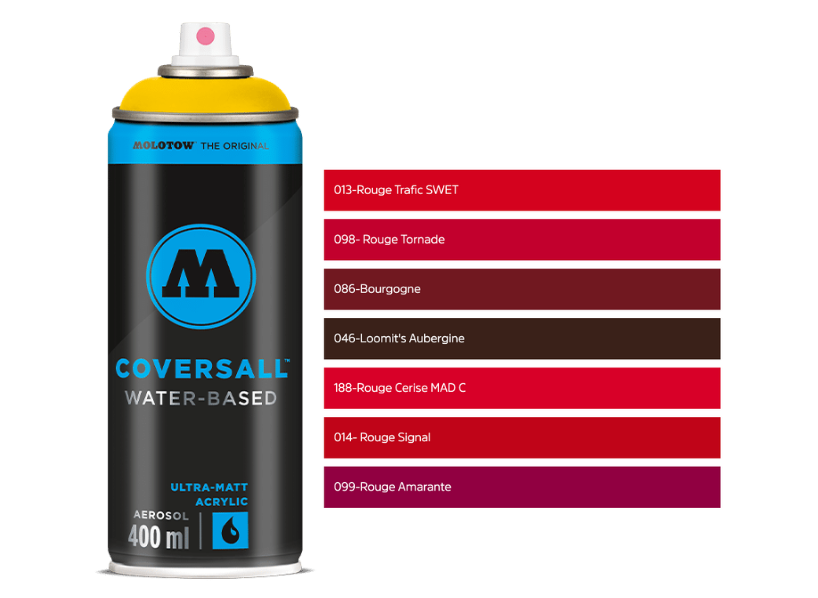 La bombe de peinture Coverall Water-Based se décline en 7 nuances de rouge, allant du rouge vif éclatant au rouge profond plus sombre. Formulée avec des solvants majoritairement à base d’eau, elle offre une application plus confortable, sans les odeurs fortes habituellement associées aux peintures en spray.