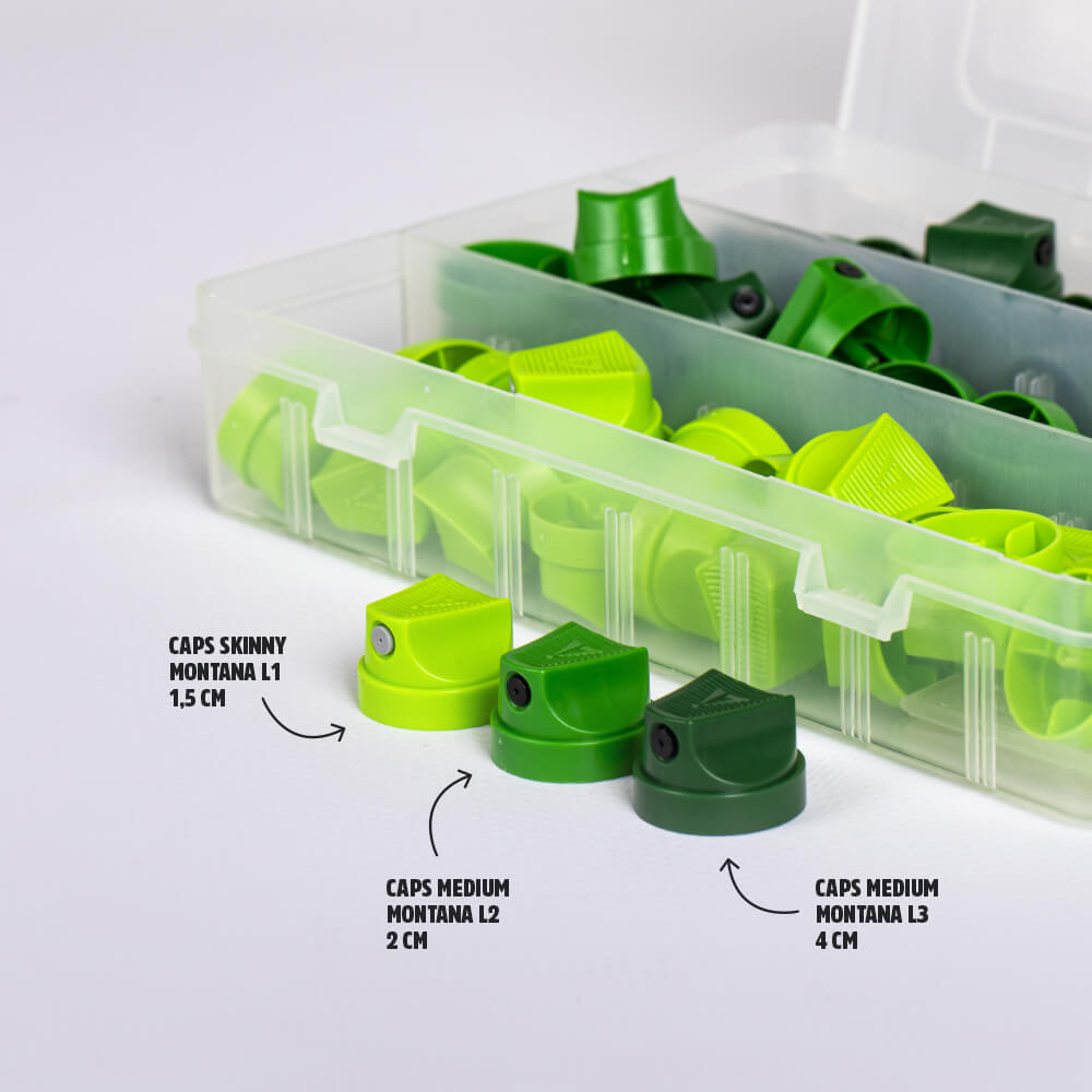 Les caps à débit moyens sont les diffuseurs les plus polyvalents, c'est pour cette raison qu'ils sont fournis d'origine sur de nombreuses gammes de bombes de peinture. Ces buses de pulvérisation universelles sont adaptables sur tous nos aérosols de peinture et de vernis. Nous vous invitons à essayer les caps Montanta L2 et L3 : ils permettent d'obtenir des tracés nets, et sont parfaits pour les projets de taille moyenne.