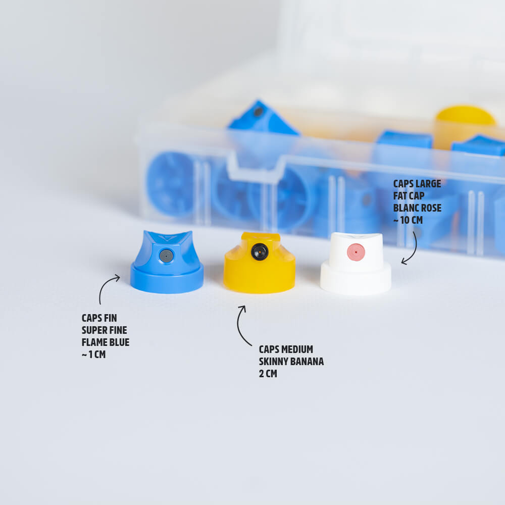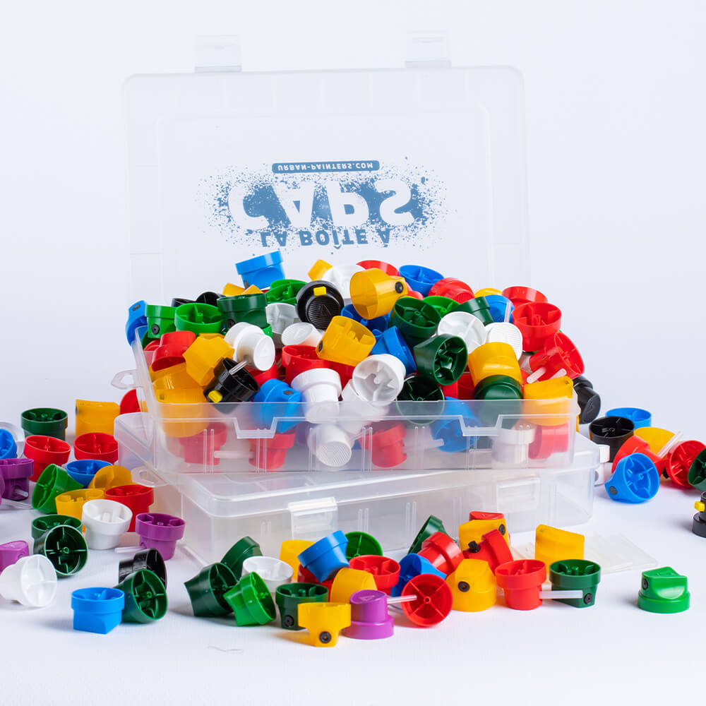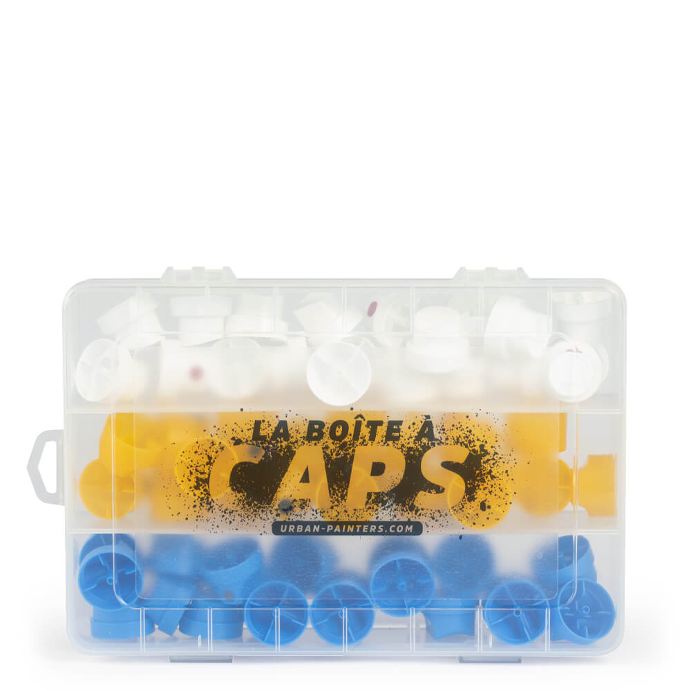 Le cap pour bombe de peinture est un embout (ou diffuseur de peinture) amovible par lequel le produit sort de l'aérosol. Il est placé sur la valve de la bombe, et peut facilement être remplacé. Les caps sont des consommables : à force d'être utilisés, ils finissent inévitablement par se boucher, il est donc prudent qu'en avoir toujours quelques-uns en réserve pour éviter les mauvaises surprises. Vous pourriez aussi avoir envie de changer le cap d'origine de votre bombe de peinture pour modifier la façon dont la peinture est diffusée. Changer cet embout va en effet permettre de moduler le débit de peinture ainsi que la largeur du trait obtenu. En changeant simplement de caps, vous obtenez instantanément des tracés plus fins, plus larges, ou de forme différente. Idéal pour tous vos projets de peinture graffiti ou de street art ! Vous l'aurez compris, ces produits sont des accessoires incontournables pour adapter n’importe quelle bombe de peinture à chacun de vos projets ! Vous retrouverez dans cette catégorie toutes sortes de caps universels, adaptables sur toutes nos bombes de peinture et de vernis : caps fins (super skinny, fine…), caps medium (skinny, smooth, outline...), caps larges (fat, super fat) et caps spéciaux (calligraphiques, aiguille, etc.). Vous pouvez faire votre propre sélection de références et vous procurer tous nos caps à l'unité, ou vous simplifier la vie en optant pour les boîtes à caps ou les packs que nous avons soigneusement constitués pour vous. Le lot de 30 caps et le lot de 60 caps sont des bestsellers qui vous permettront d’avoir toujours sous la main trois références incontournables pour toutes sortes de projets !